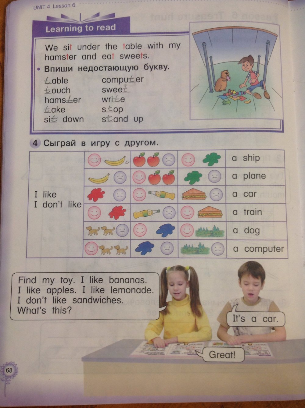В издании рассматриваются следующие темы: «Playground», «School», «Let’s have a break», «Home sweet home», «When mum’s at home», «With my best friend», «Sweet dreams», «Birthday party». Что же касается самих заданий, то они имеют следующий вид: послушай песню и скажи, кто поет каждый куплет; прочитай и соедини фразы с теми, кто их сказал; найди и обведи 5 слов; найди и раскрась буквы; пропиши буквы; спой песню с другом по ролям и прочее. Из предлагаемых упражнений видно, что все они интересные и несут развивающий характер.