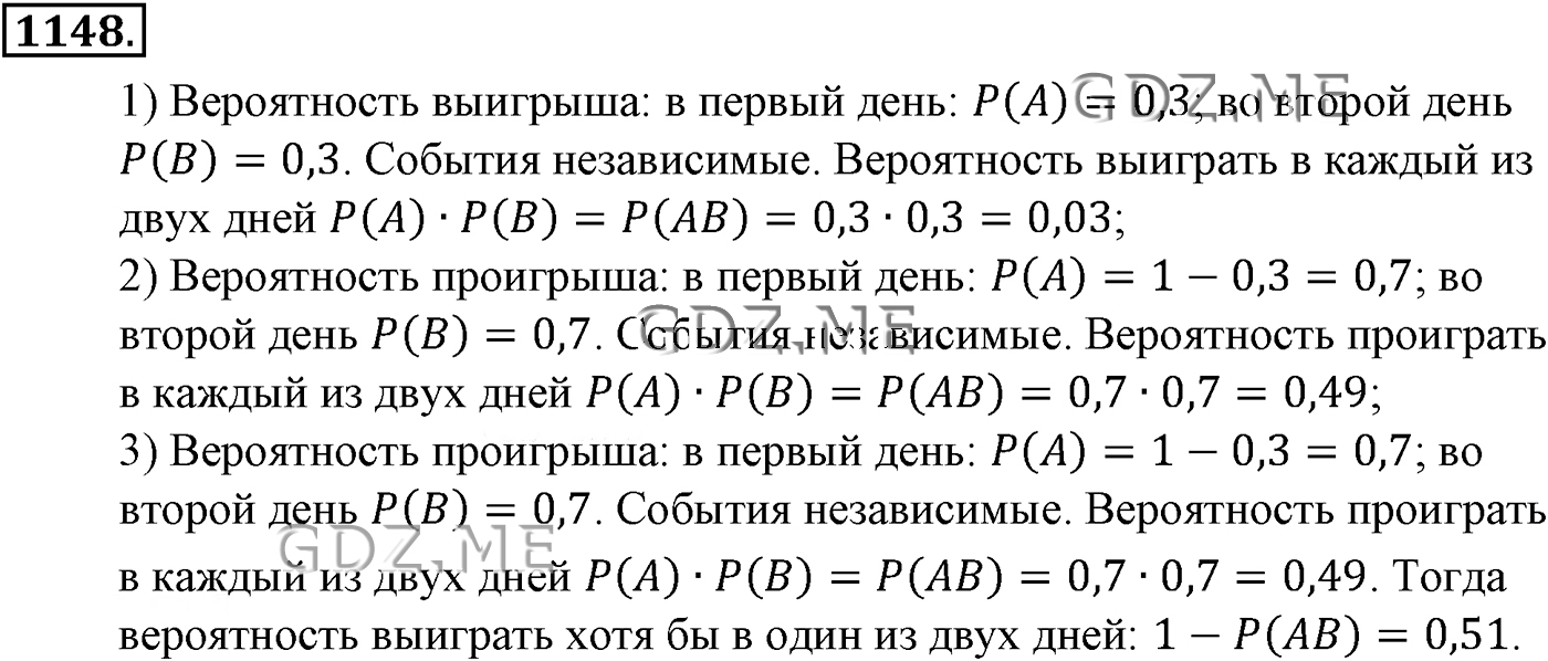 Подробный вариант решения из решебника (ГДЗ): Задание номер 1148 (Глава 12 Элементы теории вероятностей) по предмету Алгебра, за 10 класс, авторы учебника Алимов, Колягин.