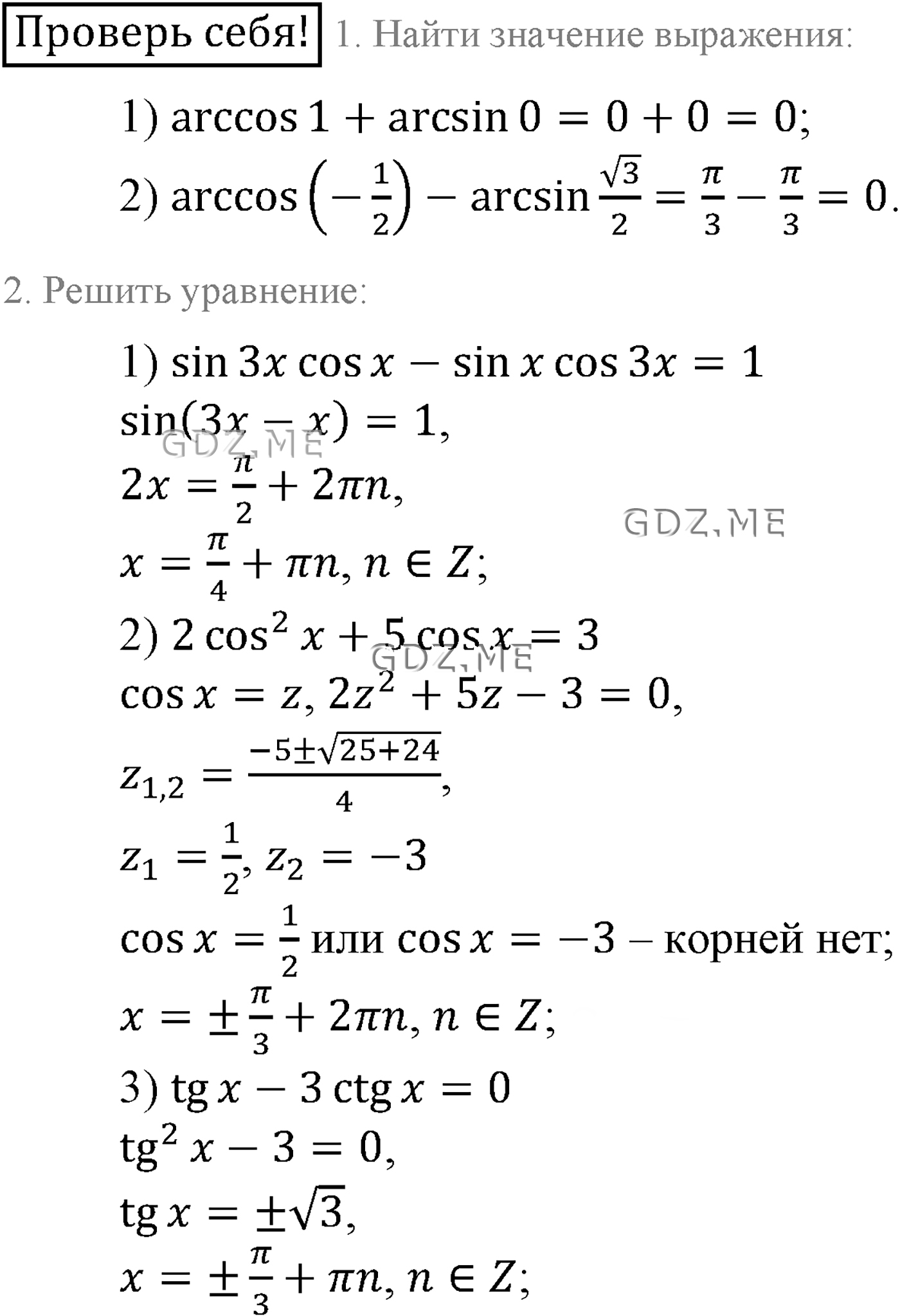 ГДЗ по Алгебре за 10 и 11 класс Алимов, Колягин. Ответ на Задание номер Проверь себя.1 (Глава 6 Тригонометрические уравнения)