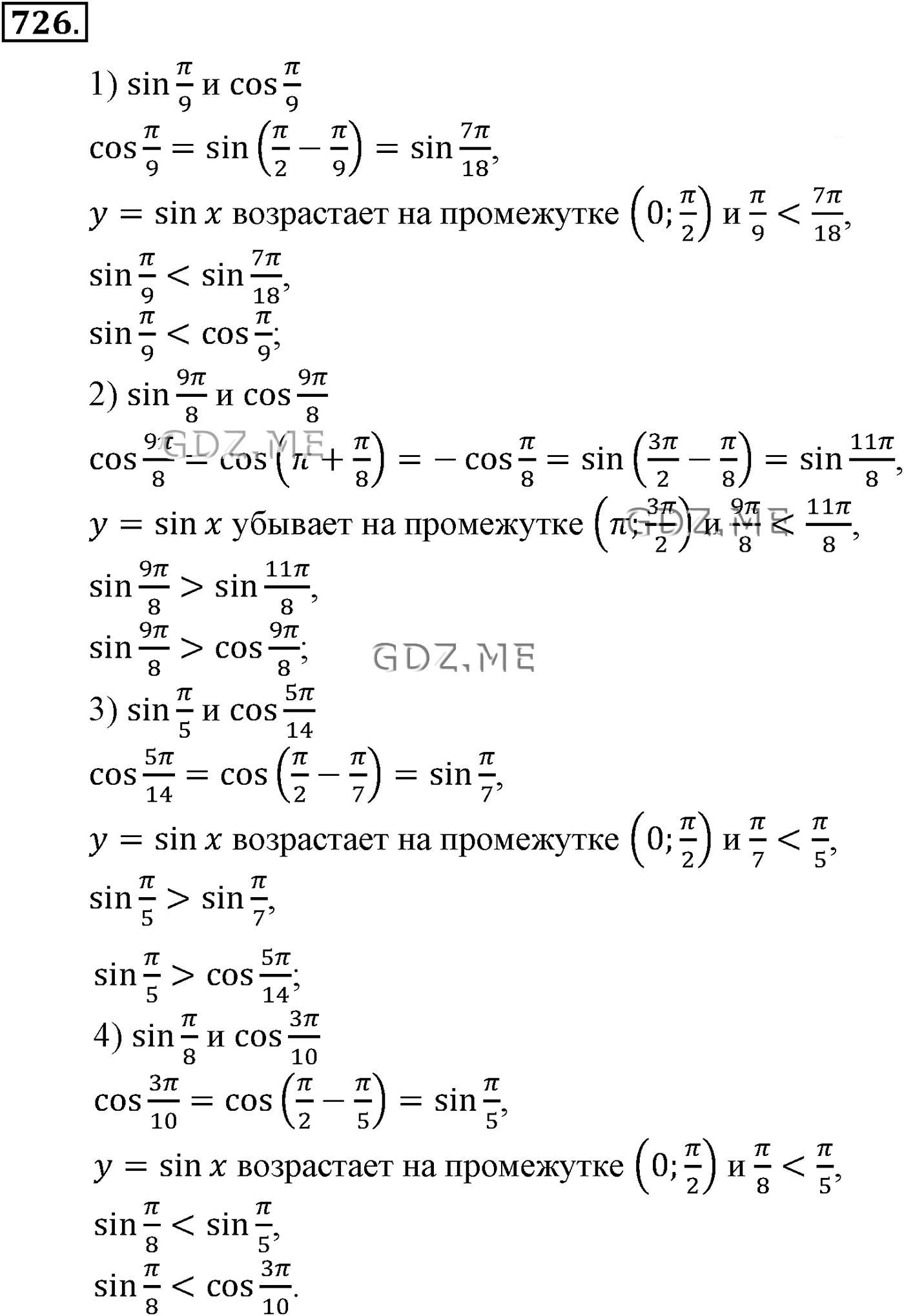 Подробный вариант решения из решебника (ГДЗ): Задание номер 726 (Глава 7 Тригонометрические функции) по предмету Алгебра, за 10 класс, авторы учебника Алимов, Колягин.