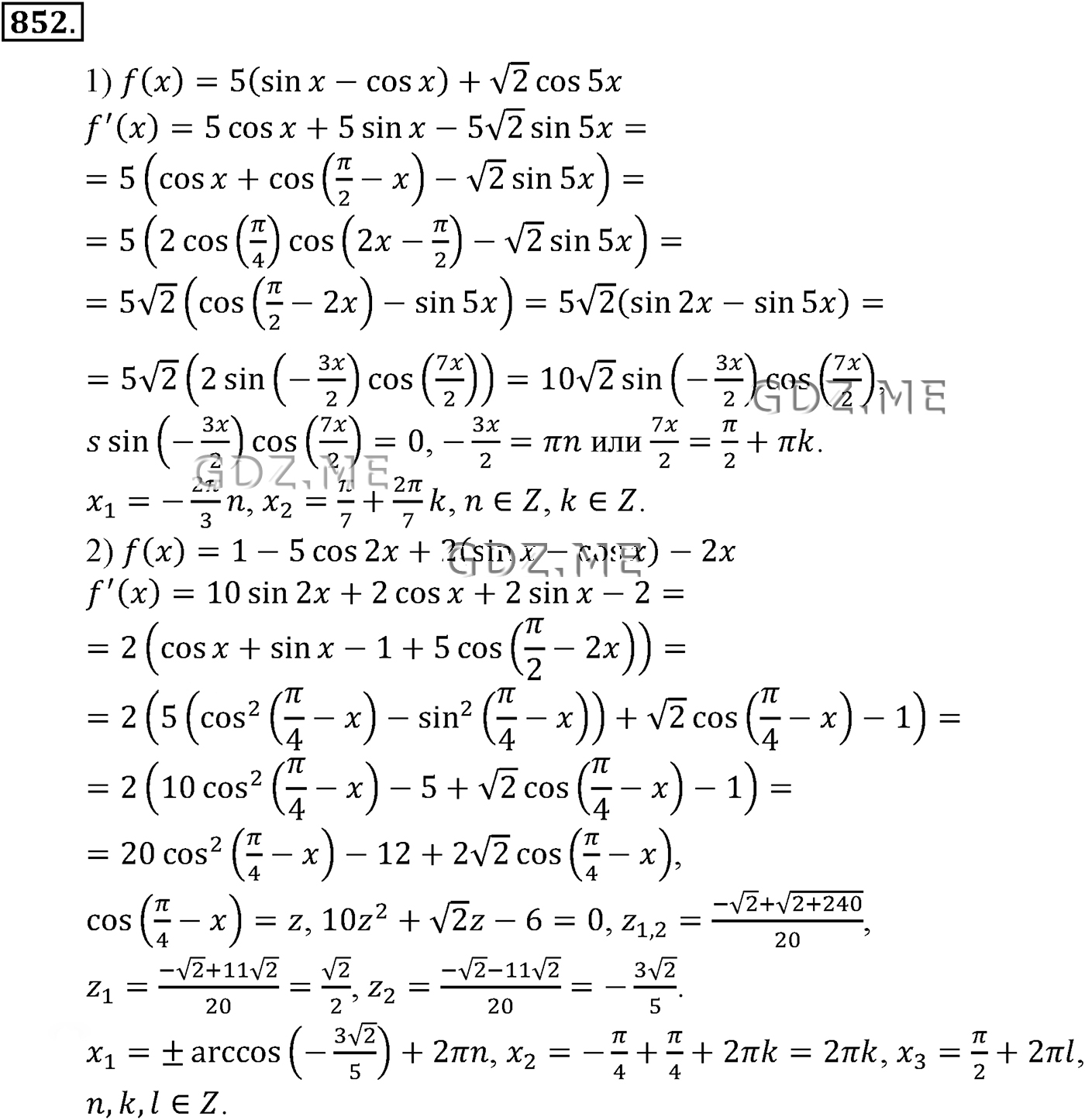 Подробный вариант решения из решебника (ГДЗ): Задание номер 852 (Глава 8 Производная и её геометрический смысл) по предмету Алгебра, за 10 класс, авторы учебника Алимов, Колягин.