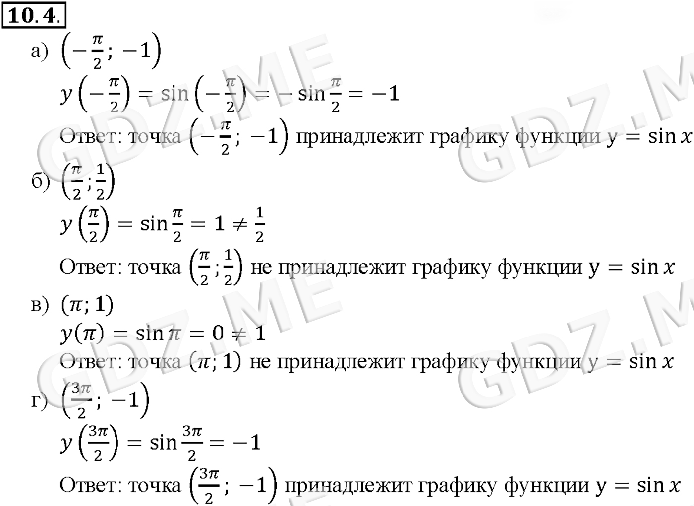 Подробный вариант решения из решебника (ГДЗ): Задание номер 10-4 (Глава 2 Тригонометрические функции. §10. Функция у = sin x, ее свойства и график) по предмету Алгебра, за 10 класс, авторы учебника Мордкович, Александрова.