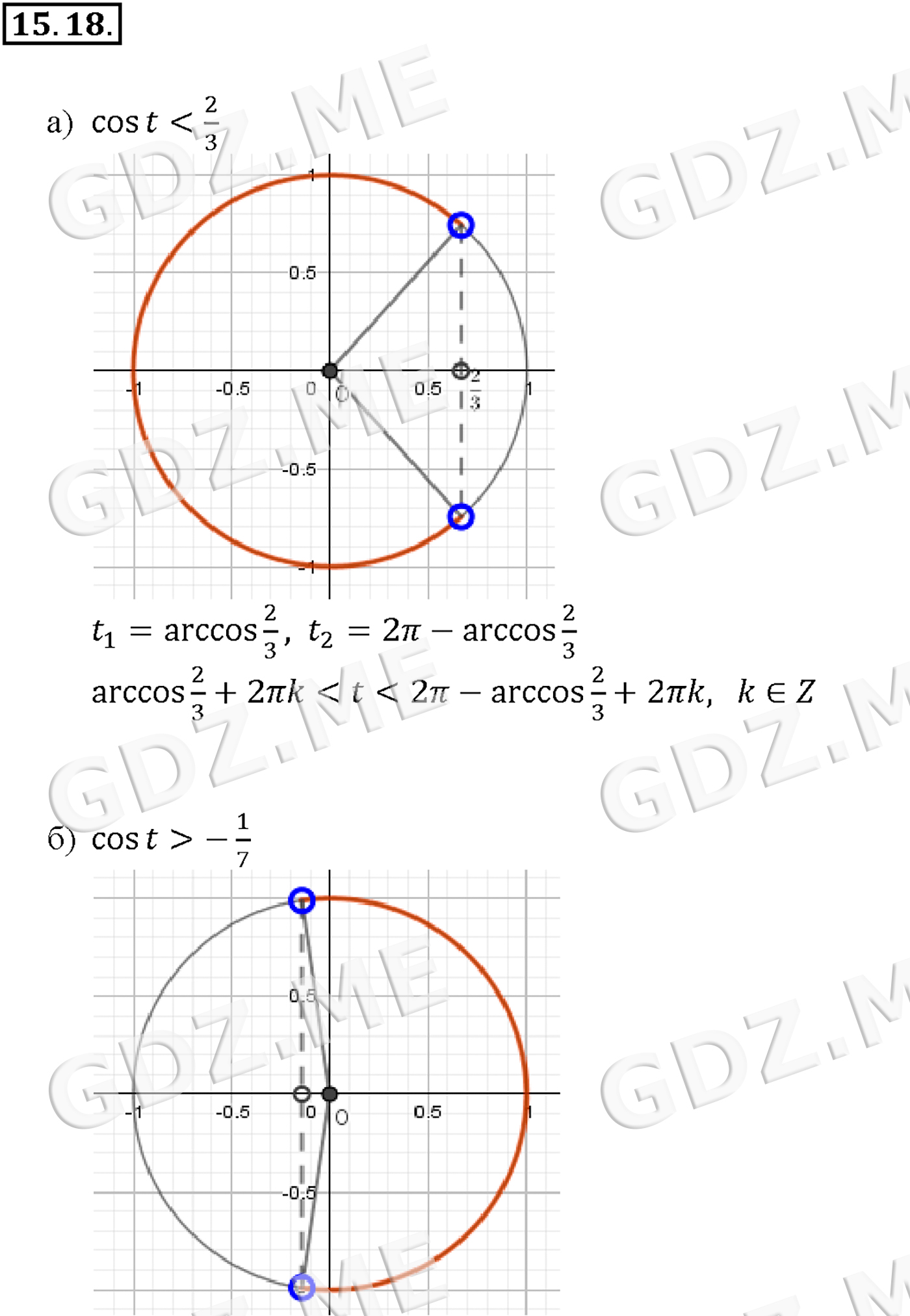 Подробный вариант решения из решебника (ГДЗ): Задание номер 15-18_1 (Глава 2 Тригонометрические функции. Глава 3 Тригонометрические уравнения. §15. Арккосинус. Решение уравнения cos t = a) по предмету Алгебра, за 10 класс, авторы учебника Мордкович, Александрова.
