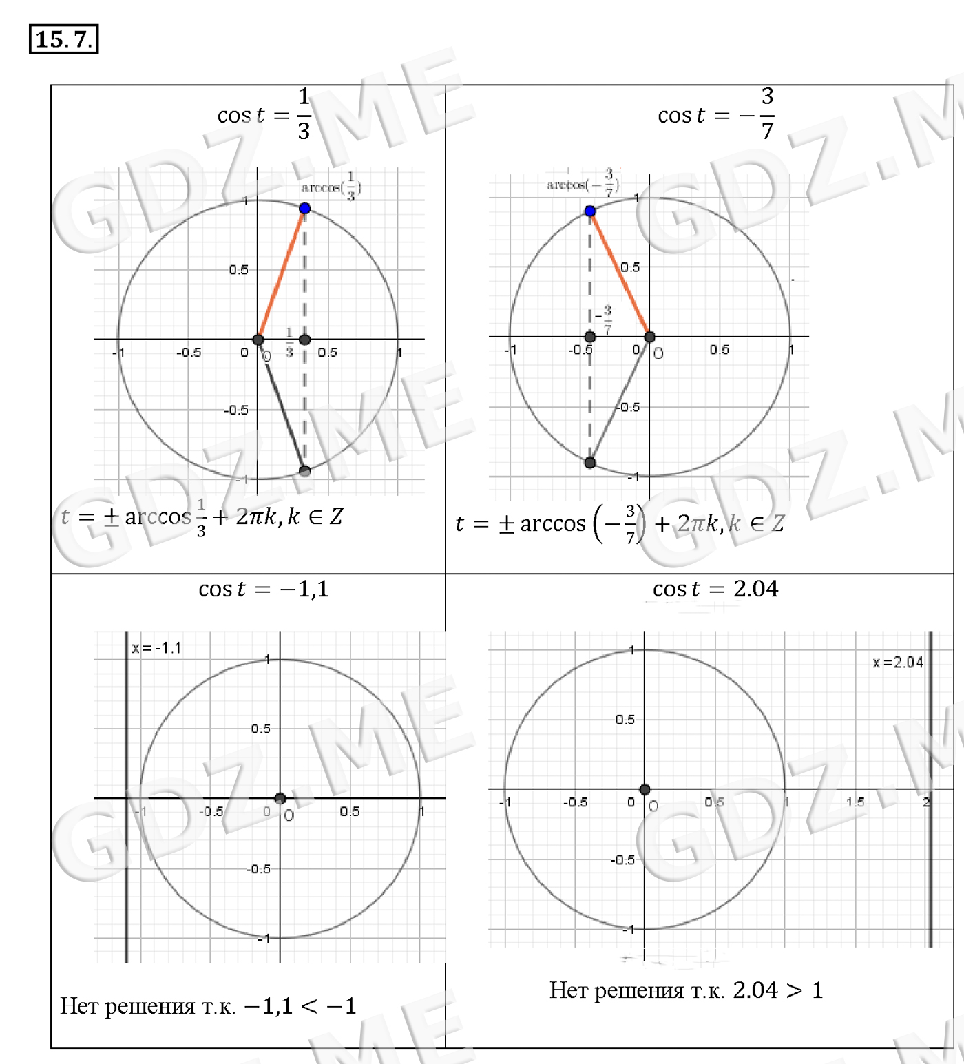 Подробный вариант решения из решебника (ГДЗ): Задание номер 15-7 (Глава 2 Тригонометрические функции. Глава 3 Тригонометрические уравнения. §15. Арккосинус. Решение уравнения cos t = a) по предмету Алгебра, за 10 класс, авторы учебника Мордкович, Александрова.