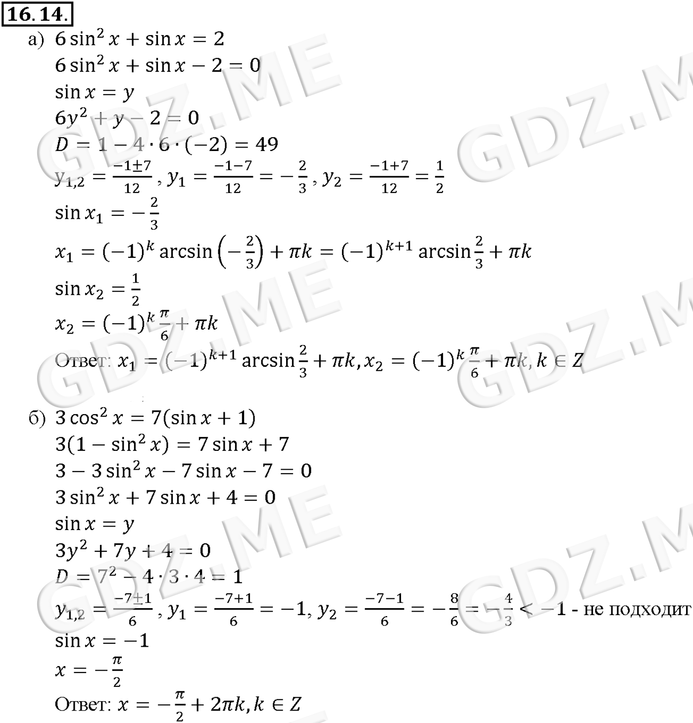 Подробный вариант решения из решебника (ГДЗ): Задание номер 16-14 (Глава 2 Тригонометрические функции. Глава 3 Тригонометрические уравнения. §16. Арксинус. Решение уравнения sin t = a) по предмету Алгебра, за 10 класс, авторы учебника Мордкович, Александрова.