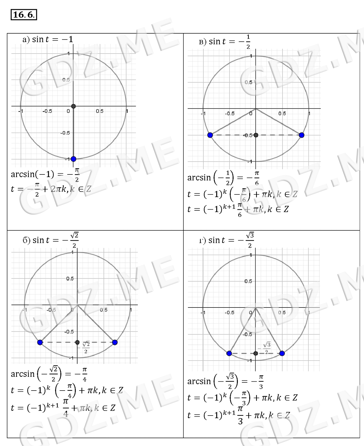 Подробный вариант решения из решебника (ГДЗ): Задание номер 16-6 (Глава 2 Тригонометрические функции. Глава 3 Тригонометрические уравнения. §16. Арксинус. Решение уравнения sin t = a) по предмету Алгебра, за 10 класс, авторы учебника Мордкович, Александрова.