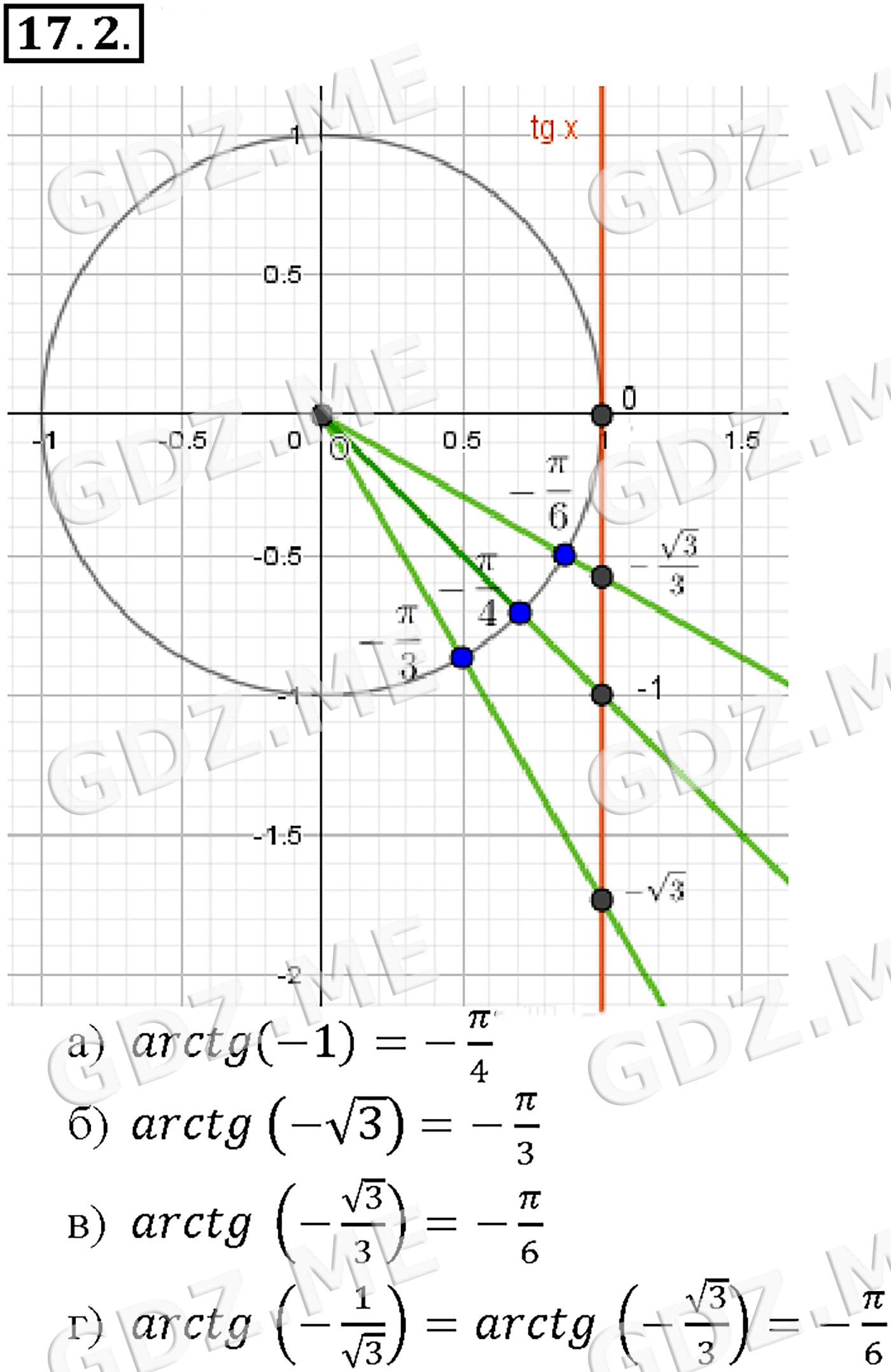 Подробный вариант решения из решебника (ГДЗ): Задание номер 17-2 (Глава 2 Тригонометрические функции. Глава 3 Тригонометрические уравнения. §17. Арктангенс и арккотангенс. Решение уравнений tg х = a, ctg х = а) по предмету Алгебра, за 10 класс, авторы учебника Мордкович, Александрова.