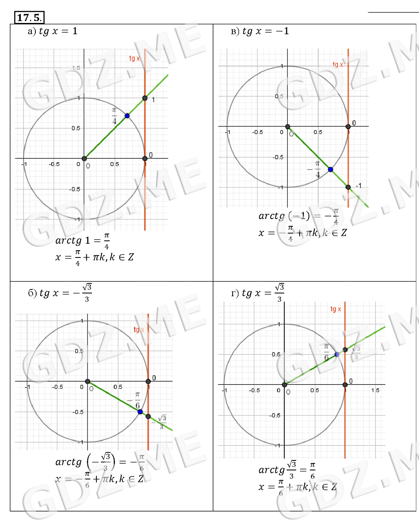Подробный вариант решения из решебника (ГДЗ): Задание номер 17-5 (Глава 2 Тригонометрические функции. Глава 3 Тригонометрические уравнения. §17. Арктангенс и арккотангенс. Решение уравнений tg х = a, ctg х = а) по предмету Алгебра, за 10 класс, авторы учебника Мордкович, Александрова.