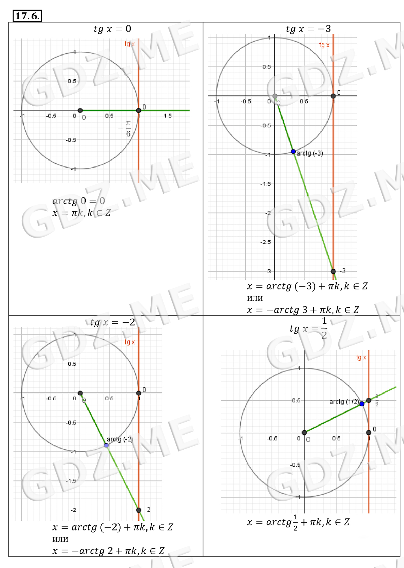 Подробный вариант решения из решебника (ГДЗ): Задание номер 17-6 (Глава 2 Тригонометрические функции. Глава 3 Тригонометрические уравнения. §17. Арктангенс и арккотангенс. Решение уравнений tg х = a, ctg х = а) по предмету Алгебра, за 10 класс, авторы учебника Мордкович, Александрова.