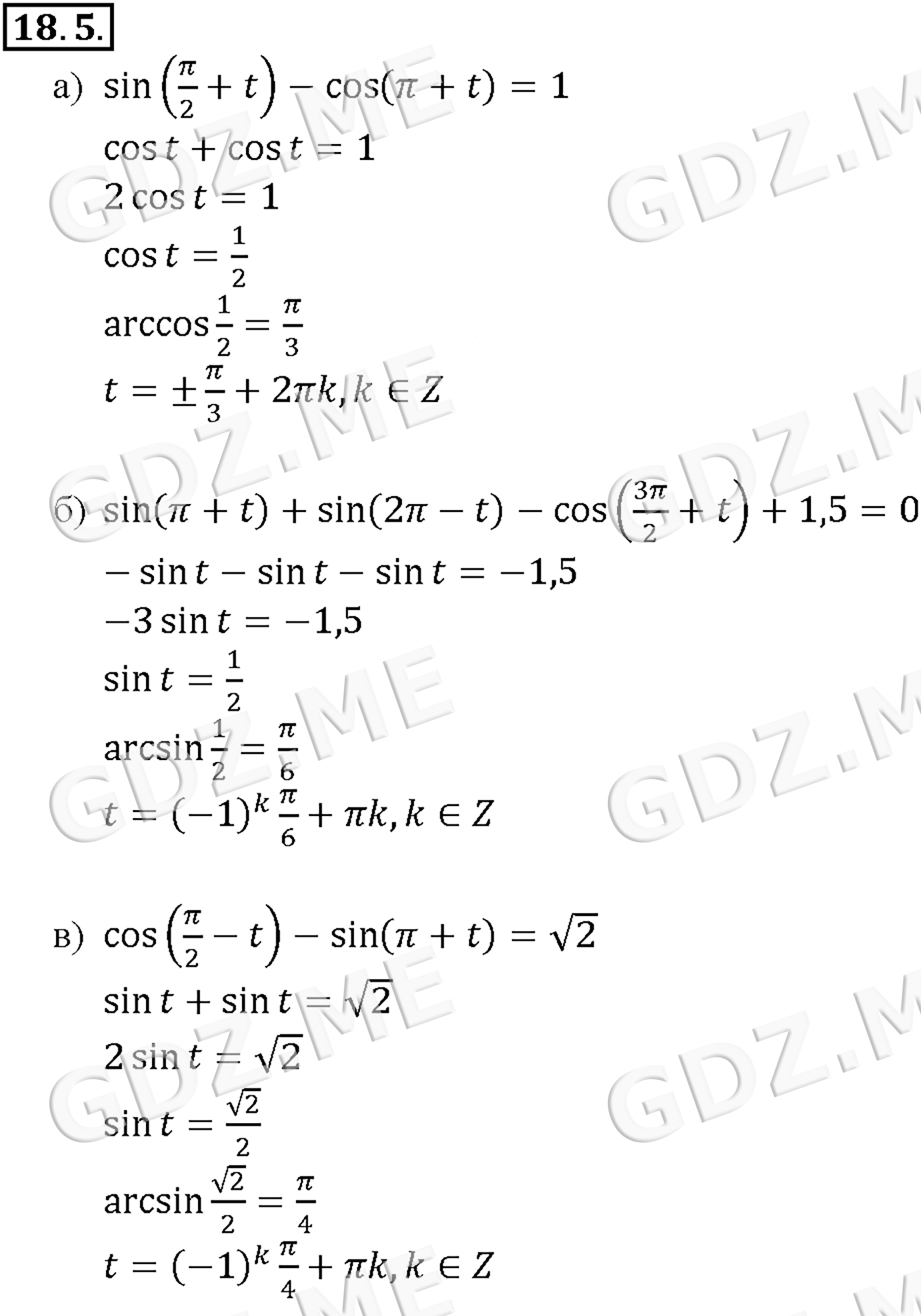 Подробный вариант решения из решебника (ГДЗ): Задание номер 18-5_1 (Глава 2 Тригонометрические функции. Глава 3 Тригонометрические уравнения. §18. Тригонометрические уравнения) по предмету Алгебра, за 10 класс, авторы учебника Мордкович, Александрова.