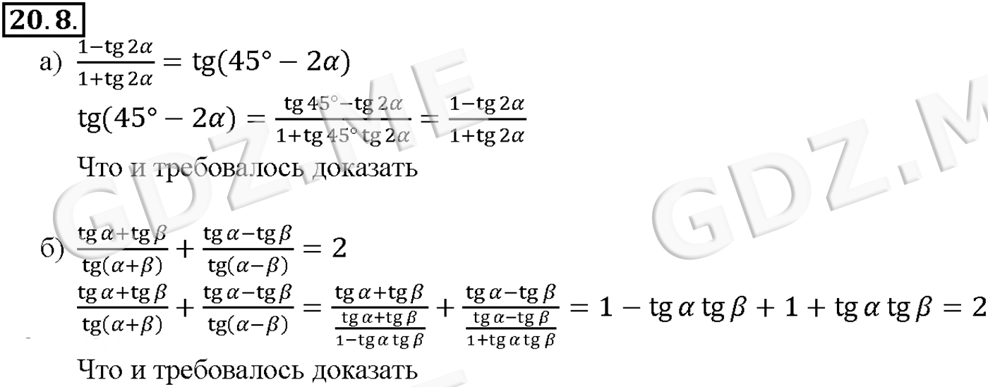 Подробный вариант решения из решебника (ГДЗ): Задание номер 20-8 (Глава 3 Тригонометрические уравнения. Глава 4 Преобразование тригонометрических выражений. §20. Тангенс суммы и разности аргументов) по предмету Алгебра, за 10 класс, авторы учебника Мордкович, Александрова.