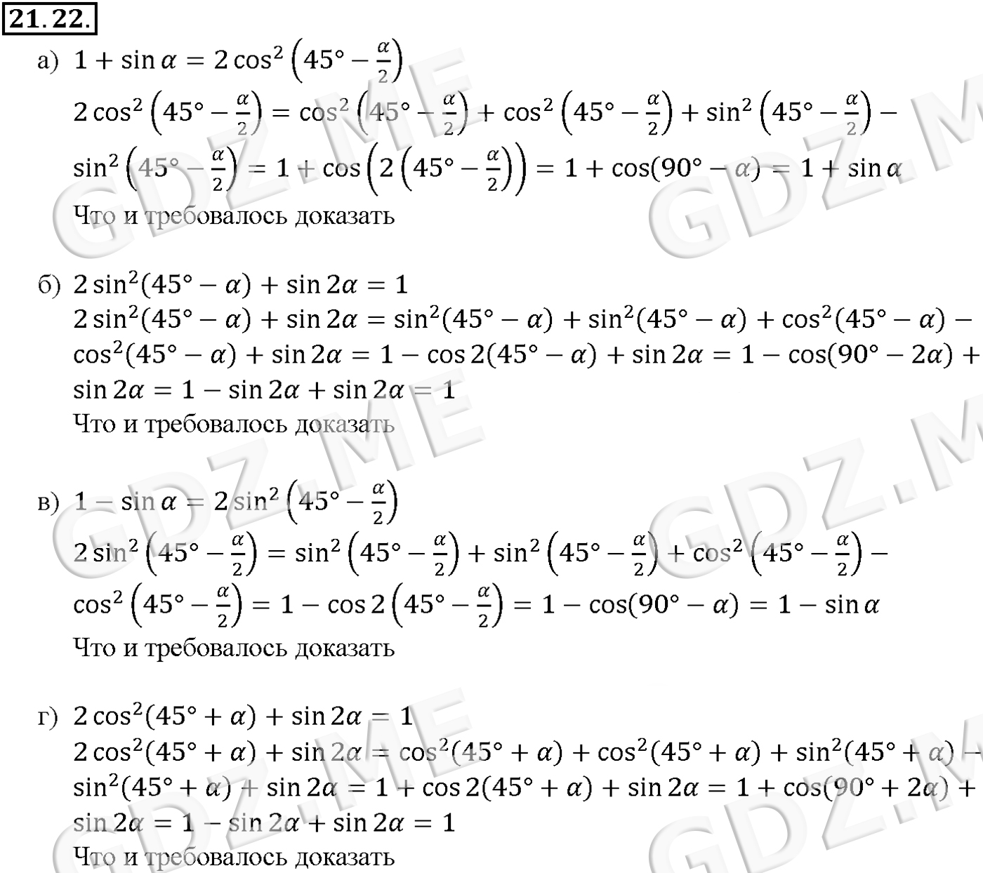 Подробный вариант решения из решебника (ГДЗ): Задание номер 21-22 (Глава 3 Тригонометрические уравнения. Глава 4 Преобразование тригонометрических выражений. §21. Формулы двойного аргумента) по предмету Алгебра, за 10 класс, авторы учебника Мордкович, Александрова.
