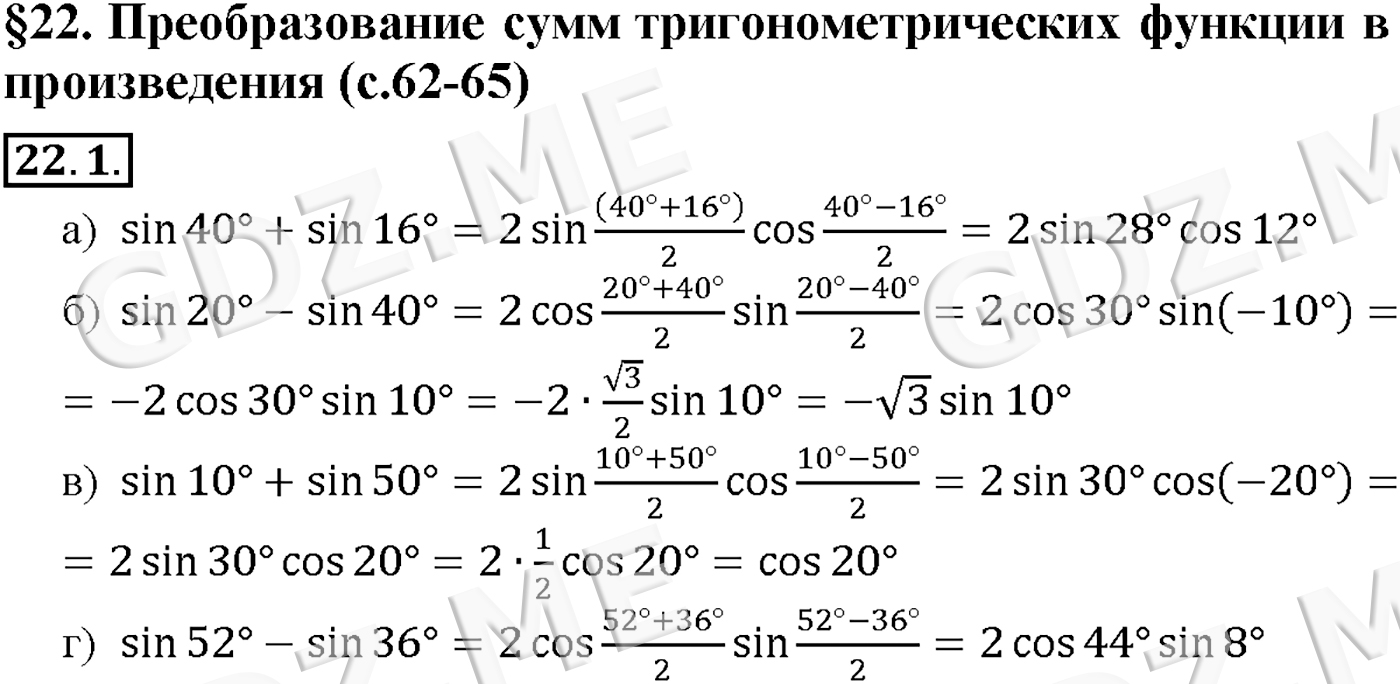 Подробный вариант решения из решебника (ГДЗ): Задание номер 22-1 (Глава 3 Тригонометрические уравнения. Глава 4 Преобразование тригонометрических выражений. §22. Преобразование сумм тригонометрических функций в произведения) по предмету Алгебра, за 10 класс, авторы учебника Мордкович, Александрова.