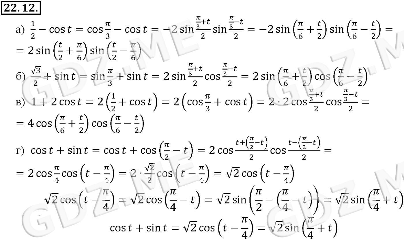 Подробный вариант решения из решебника (ГДЗ): Задание номер 22-12 (Глава 3 Тригонометрические уравнения. Глава 4 Преобразование тригонометрических выражений. §22. Преобразование сумм тригонометрических функций в произведения) по предмету Алгебра, за 10 класс, авторы учебника Мордкович, Александрова.