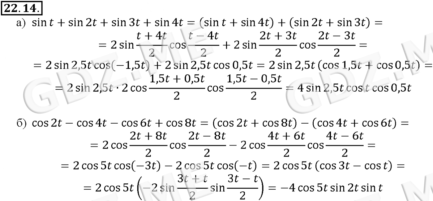 Подробный вариант решения из решебника (ГДЗ): Задание номер 22-14 (Глава 3 Тригонометрические уравнения. Глава 4 Преобразование тригонометрических выражений. §22. Преобразование сумм тригонометрических функций в произведения) по предмету Алгебра, за 10 класс, авторы учебника Мордкович, Александрова.