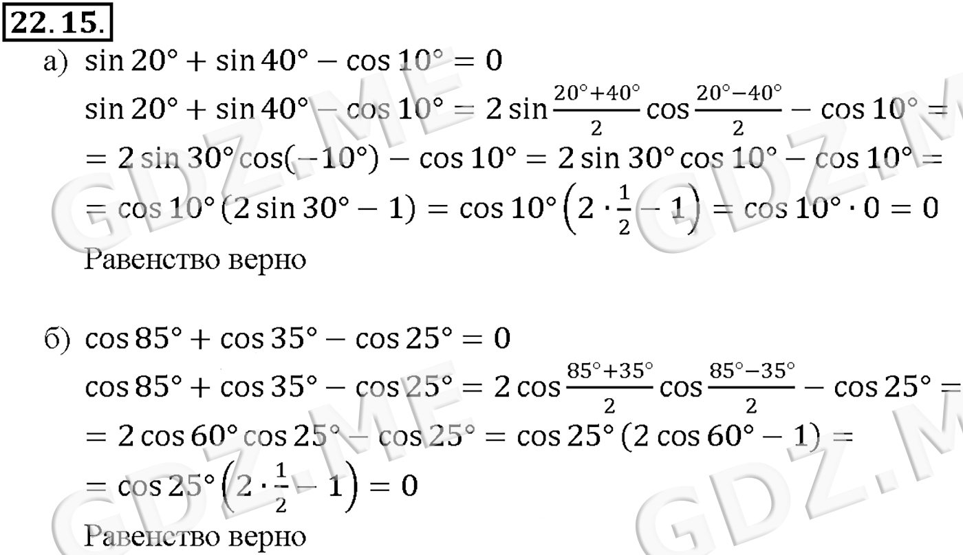 Подробный вариант решения из решебника (ГДЗ): Задание номер 22-15 (Глава 3 Тригонометрические уравнения. Глава 4 Преобразование тригонометрических выражений. §22. Преобразование сумм тригонометрических функций в произведения) по предмету Алгебра, за 10 класс, авторы учебника Мордкович, Александрова.