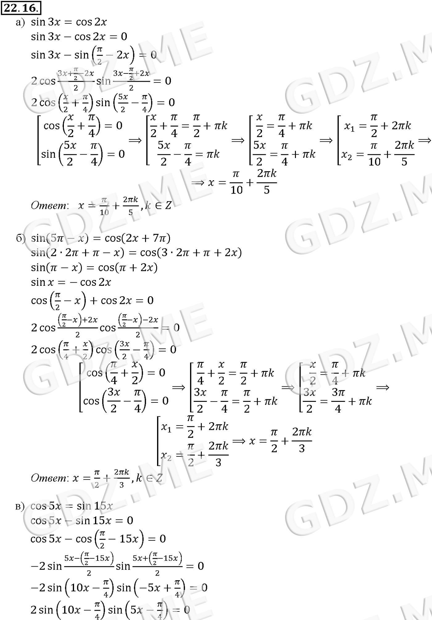 Подробный вариант решения из решебника (ГДЗ): Задание номер 22-16_1 (Глава 3 Тригонометрические уравнения. Глава 4 Преобразование тригонометрических выражений. §22. Преобразование сумм тригонометрических функций в произведения) по предмету Алгебра, за 10 класс, авторы учебника Мордкович, Александрова.