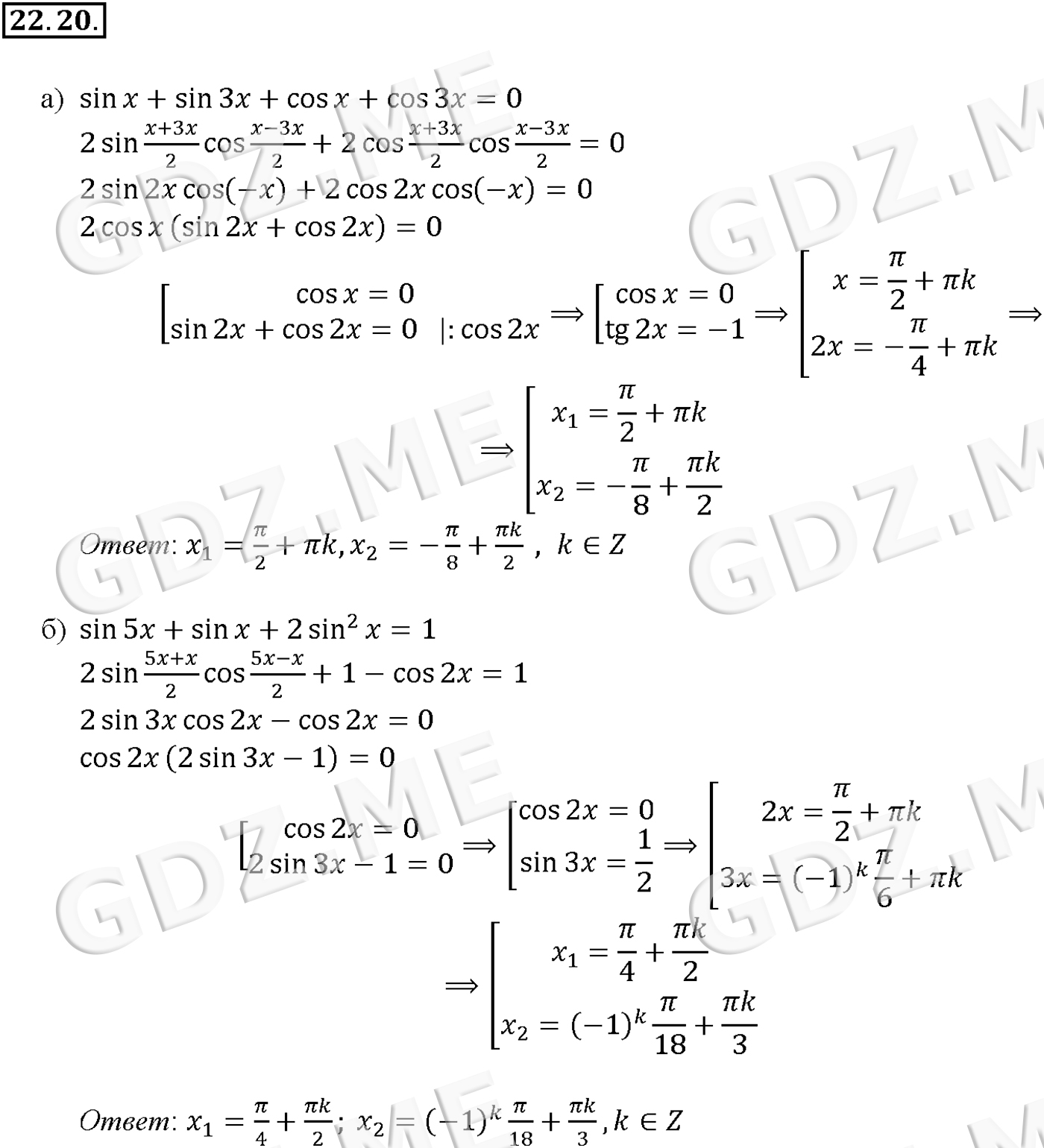 Подробный вариант решения из решебника (ГДЗ): Задание номер 22-20 (Глава 3 Тригонометрические уравнения. Глава 4 Преобразование тригонометрических выражений. §22. Преобразование сумм тригонометрических функций в произведения) по предмету Алгебра, за 10 класс, авторы учебника Мордкович, Александрова.