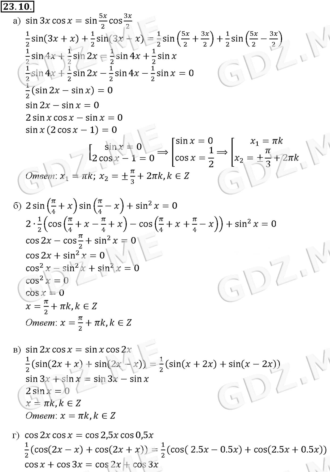Подробный вариант решения из решебника (ГДЗ): Задание номер 23-10_1 (Глава 3 Тригонометрические уравнения. Глава 4 Преобразование тригонометрических выражений. §23. Преобразование произведений тригонометрических функций в суммы) по предмету Алгебра, за 10 класс, авторы учебника Мордкович, Александрова.