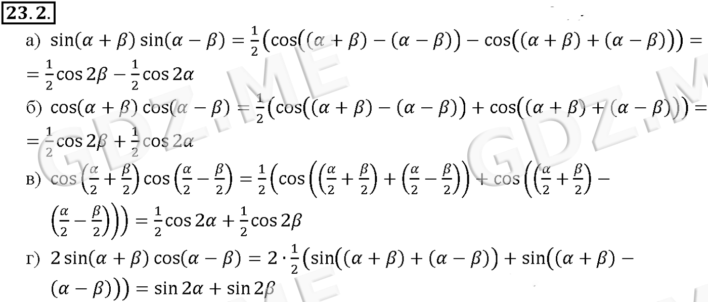Подробный вариант решения из решебника (ГДЗ): Задание номер 23-2 (Глава 3 Тригонометрические уравнения. Глава 4 Преобразование тригонометрических выражений. §23. Преобразование произведений тригонометрических функций в суммы) по предмету Алгебра, за 10 класс, авторы учебника Мордкович, Александрова.