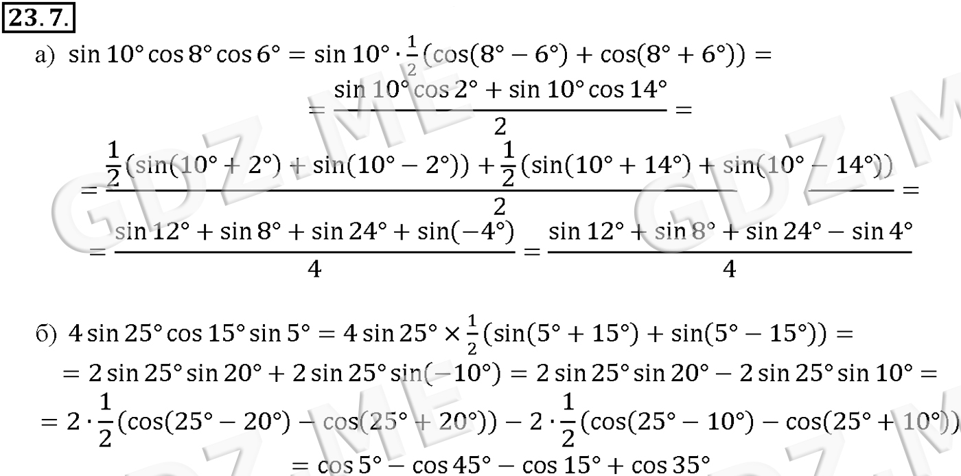 Подробный вариант решения из решебника (ГДЗ): Задание номер 23-7 (Глава 3 Тригонометрические уравнения. Глава 4 Преобразование тригонометрических выражений. §23. Преобразование произведений тригонометрических функций в суммы) по предмету Алгебра, за 10 класс, авторы учебника Мордкович, Александрова.