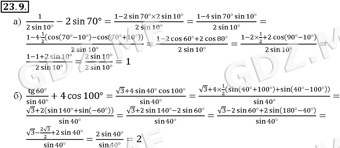 Подробный вариант решения из решебника (ГДЗ): Задание номер 23-9 (Глава 3 Тригонометрические уравнения. Глава 4 Преобразование тригонометрических выражений. §23. Преобразование произведений тригонометрических функций в суммы) по предмету Алгебра, за 10 класс, авторы учебника Мордкович, Александрова.