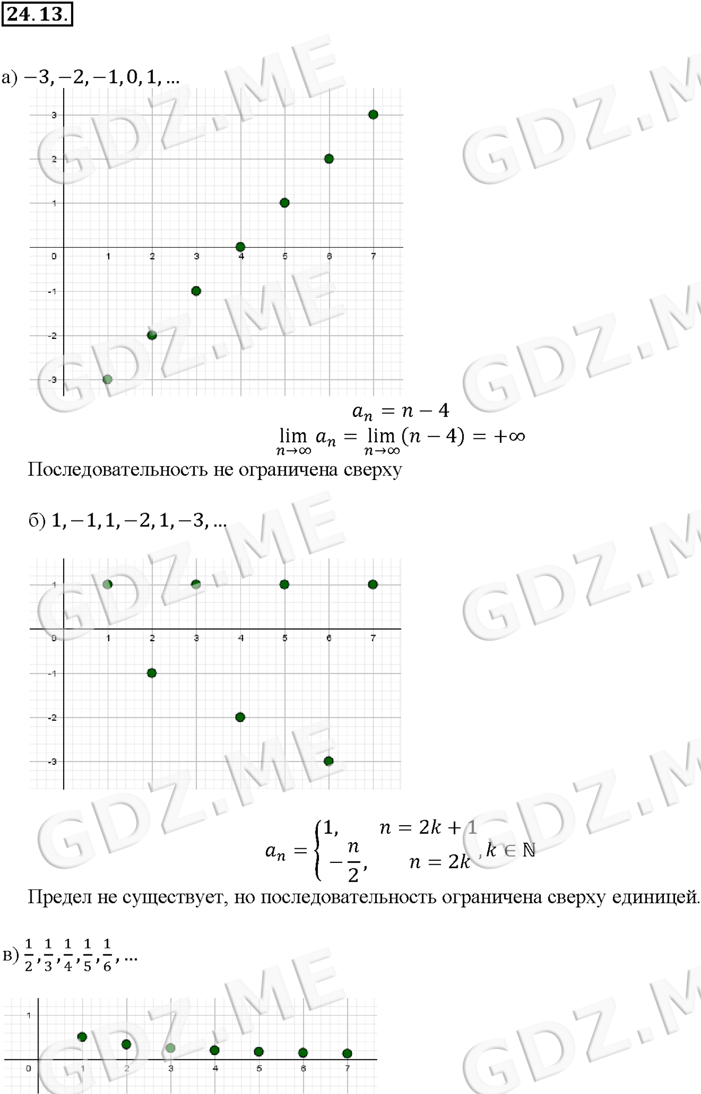 Подробный вариант решения из решебника (ГДЗ): Задание номер 24-13_1 (Глава 4 Преобразование тригонометрических выражений. Глава 5 Производная. §24. Предел последовательности) по предмету Алгебра, за 10 класс, авторы учебника Мордкович, Александрова.
