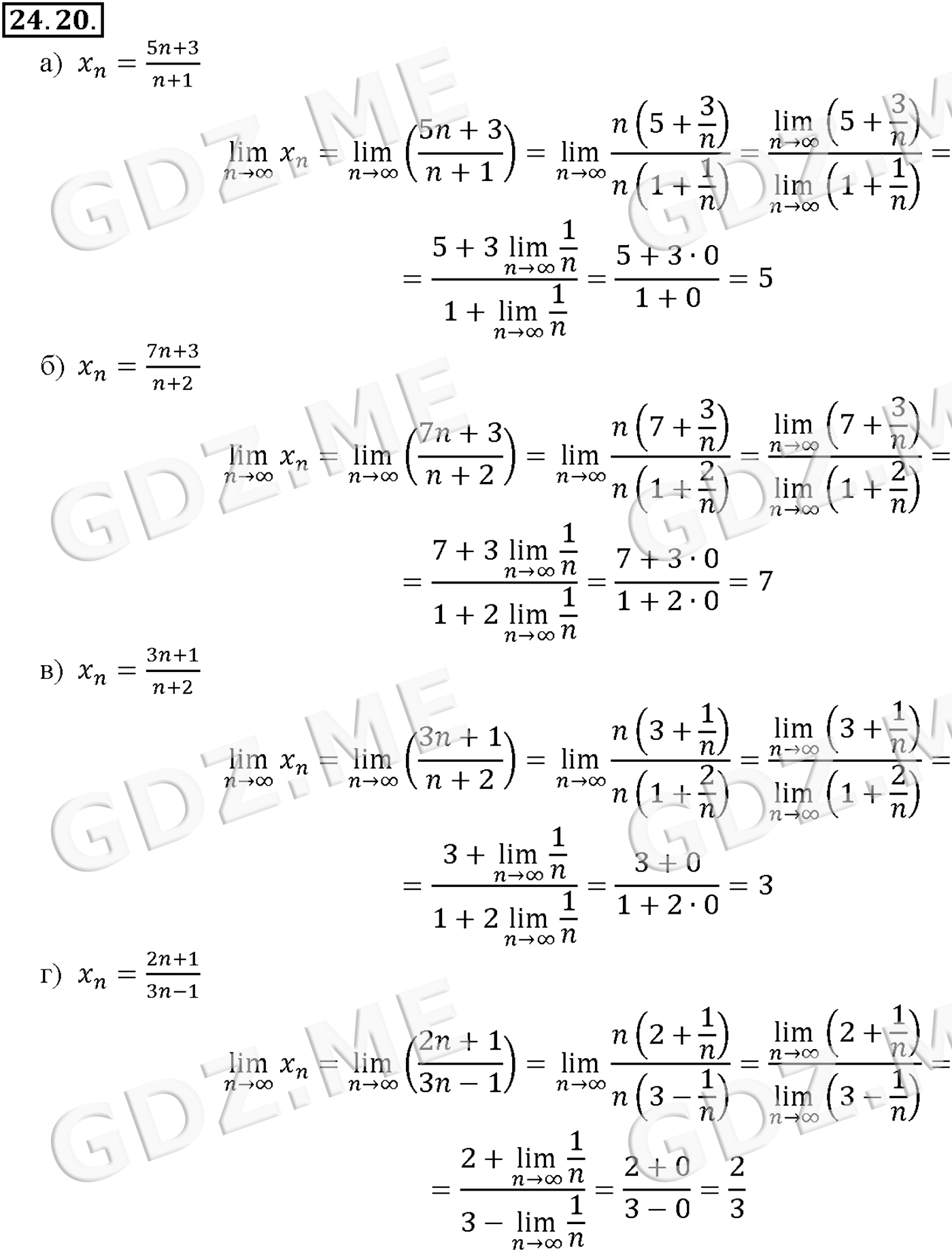 Подробный вариант решения из решебника (ГДЗ): Задание номер 24-20 (Глава 4 Преобразование тригонометрических выражений. Глава 5 Производная. §24. Предел последовательности) по предмету Алгебра, за 10 класс, авторы учебника Мордкович, Александрова.