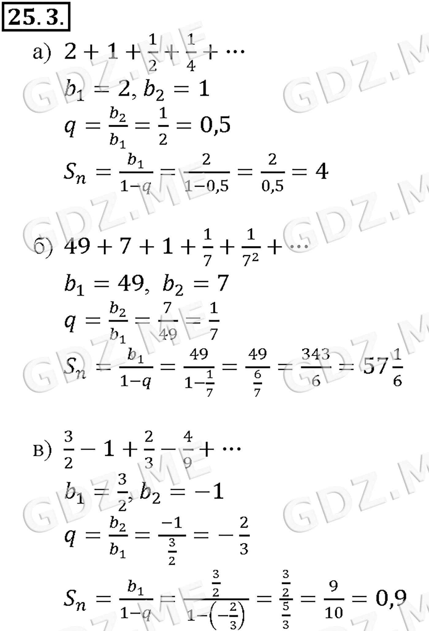 Подробный вариант решения из решебника (ГДЗ): Задание номер 25-3_1 (Глава 4 Преобразование тригонометрических выражений. Глава 5 Производная. §25. Сумма бесконечной геометрической прогрессии) по предмету Алгебра, за 10 класс, авторы учебника Мордкович, Александрова.
