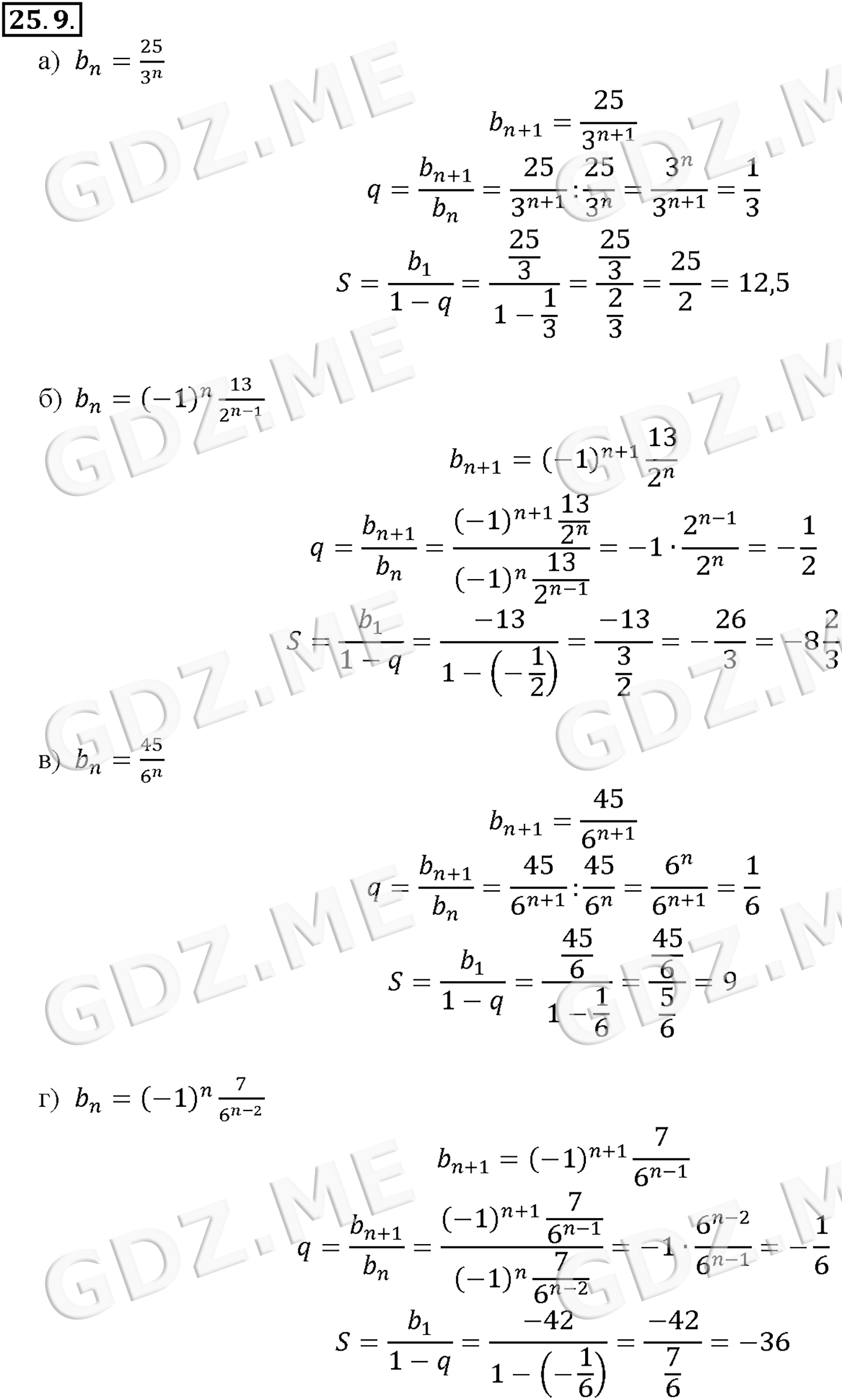 Подробный вариант решения из решебника (ГДЗ): Задание номер 25-9 (Глава 4 Преобразование тригонометрических выражений. Глава 5 Производная. §25. Сумма бесконечной геометрической прогрессии) по предмету Алгебра, за 10 класс, авторы учебника Мордкович, Александрова.