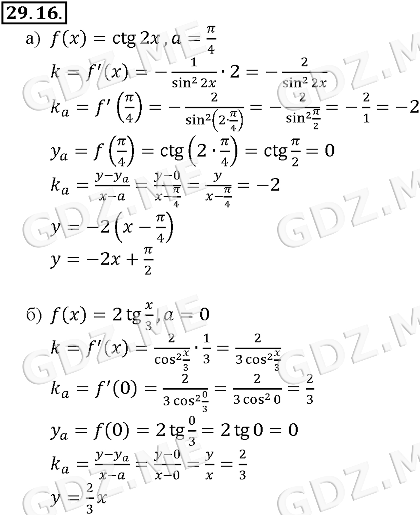 Подробный вариант решения из решебника (ГДЗ): Задание номер 29-16 (Глава 4 Преобразование тригонометрических выражений. Глава 5 Производная. §29. Уравнение касательной к графику функции) по предмету Алгебра, за 10 класс, авторы учебника Мордкович, Александрова.