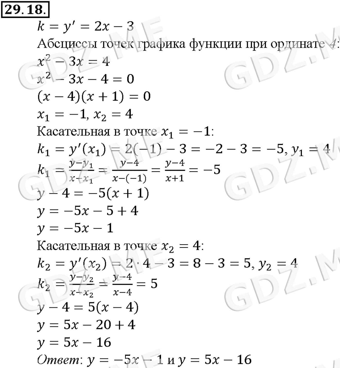 Подробный вариант решения из решебника (ГДЗ): Задание номер 29-18 (Глава 4 Преобразование тригонометрических выражений. Глава 5 Производная. §29. Уравнение касательной к графику функции) по предмету Алгебра, за 10 класс, авторы учебника Мордкович, Александрова.