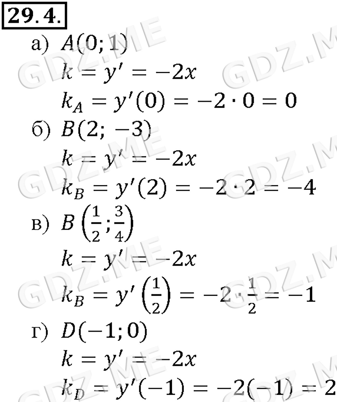 Подробный вариант решения из решебника (ГДЗ): Задание номер 29-4 (Глава 4 Преобразование тригонометрических выражений. Глава 5 Производная. §29. Уравнение касательной к графику функции) по предмету Алгебра, за 10 класс, авторы учебника Мордкович, Александрова.