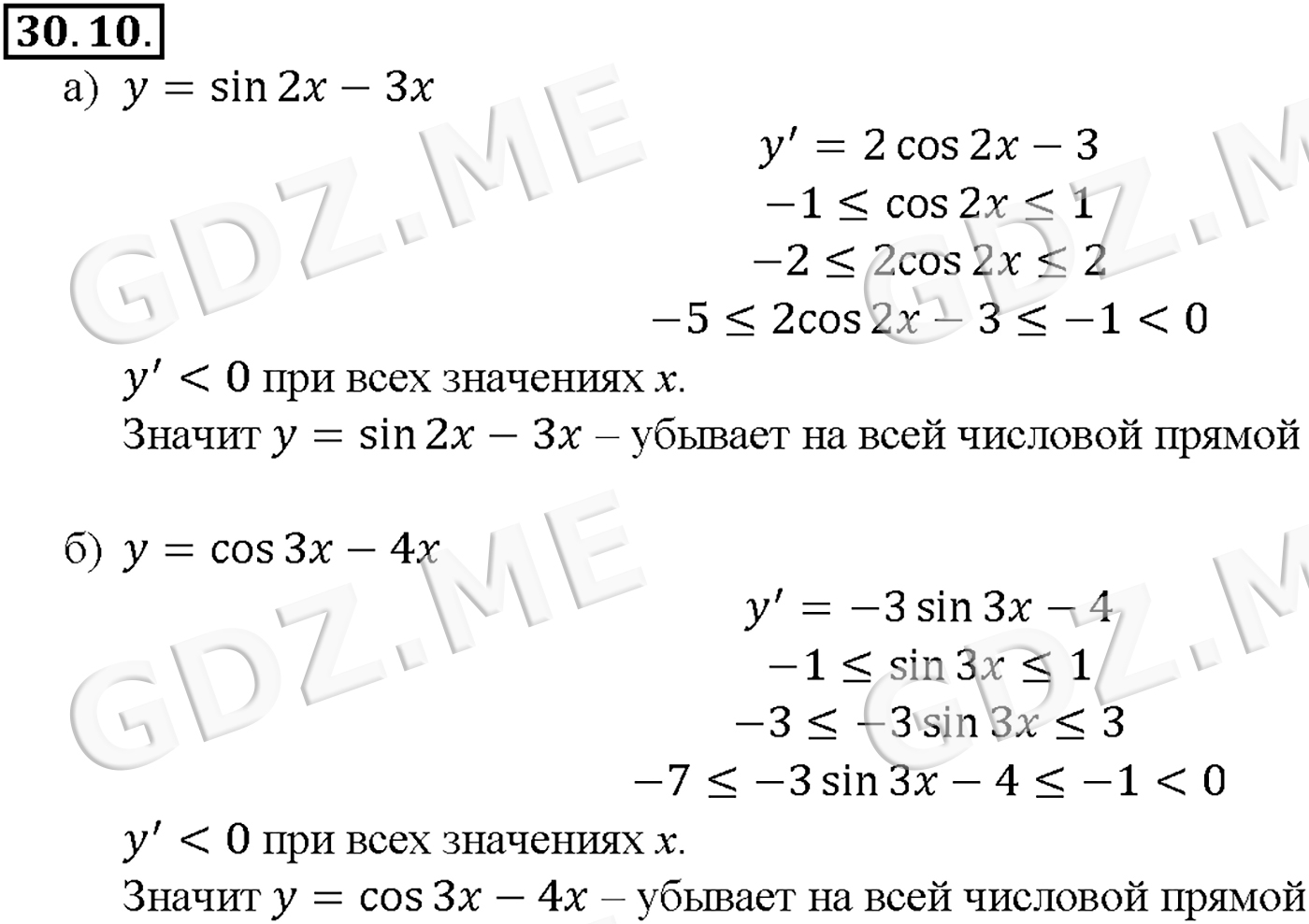 Подробный вариант решения из решебника (ГДЗ): Задание номер 30-10 (Глава 4 Преобразование тригонометрических выражений. Глава 5 Производная. §30. Применение производной для исследования функций на монотонность и экстремумы) по предмету Алгебра, за 10 класс, авторы учебника Мордкович, Александрова.