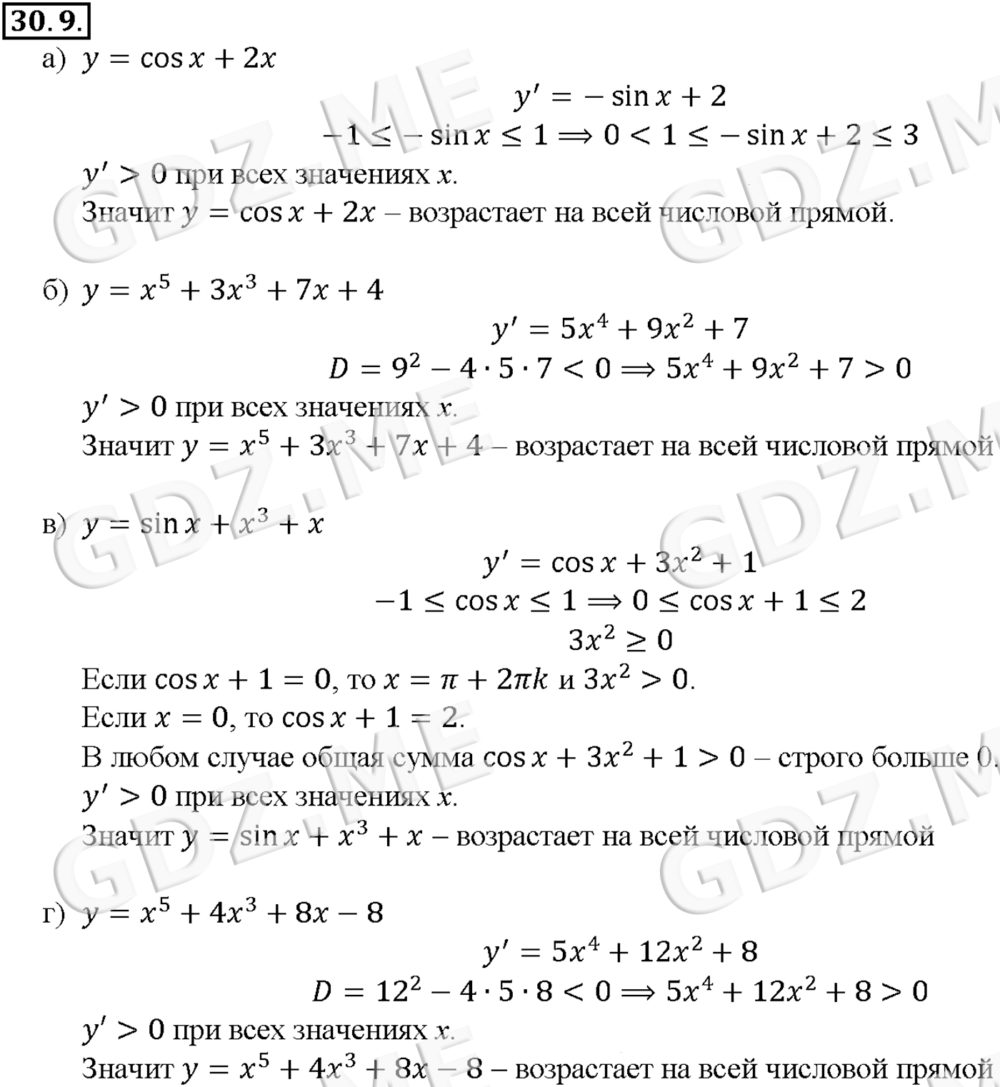 Подробный вариант решения из решебника (ГДЗ): Задание номер 30-9 (Глава 4 Преобразование тригонометрических выражений. Глава 5 Производная. §30. Применение производной для исследования функций на монотонность и экстремумы) по предмету Алгебра, за 10 класс, авторы учебника Мордкович, Александрова.