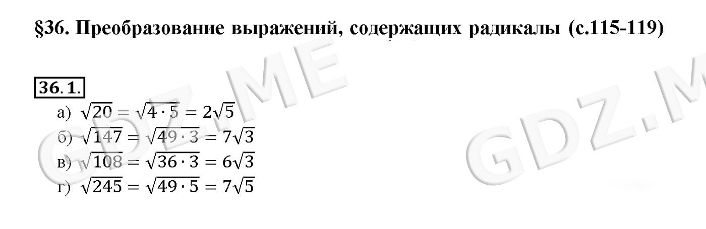 Подробный вариант решения из решебника (ГДЗ): Задание номер 36-1 (Глава 5 Производная. Глава 6 Степени и корни. Степенные функции. §36. Преобразование выражений, содержащих радикалы) по предмету Алгебра, за 10 класс, авторы учебника Мордкович, Александрова.