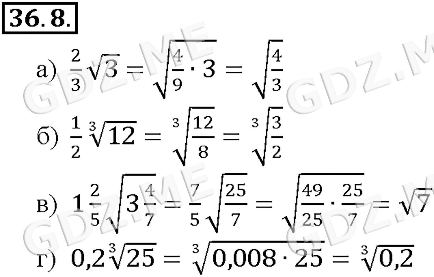 Подробный вариант решения из решебника (ГДЗ): Задание номер 36-8 (Глава 5 Производная. Глава 6 Степени и корни. Степенные функции. §36. Преобразование выражений, содержащих радикалы) по предмету Алгебра, за 10 класс, авторы учебника Мордкович, Александрова.