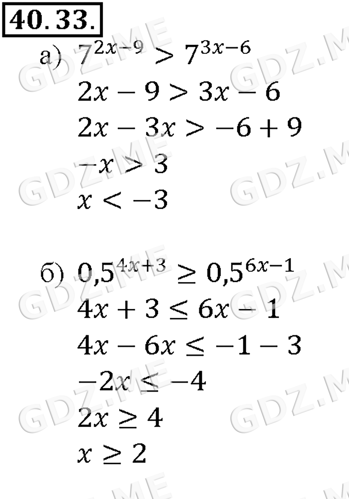 Подробный вариант решения из решебника (ГДЗ): Задание номер 40-33_1 (Глава 6 Степени и корни. Степенные функции. Глава 7 Показательная и логарифмическая функции. §40. Показательные уравнения и неравенства) по предмету Алгебра, за 10 класс, авторы учебника Мордкович, Александрова.