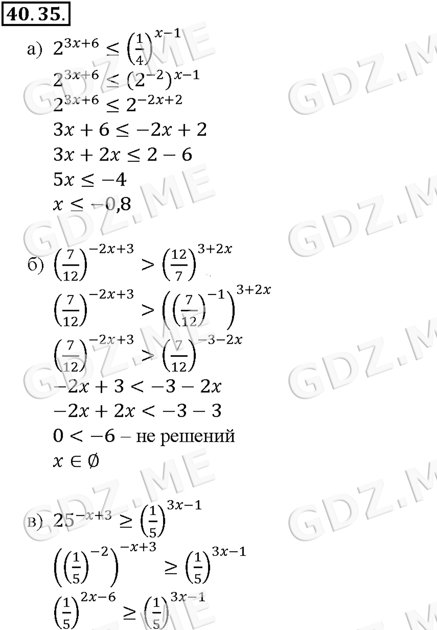 Подробный вариант решения из решебника (ГДЗ): Задание номер 40-35_1 (Глава 6 Степени и корни. Степенные функции. Глава 7 Показательная и логарифмическая функции. §40. Показательные уравнения и неравенства) по предмету Алгебра, за 10 класс, авторы учебника Мордкович, Александрова.
