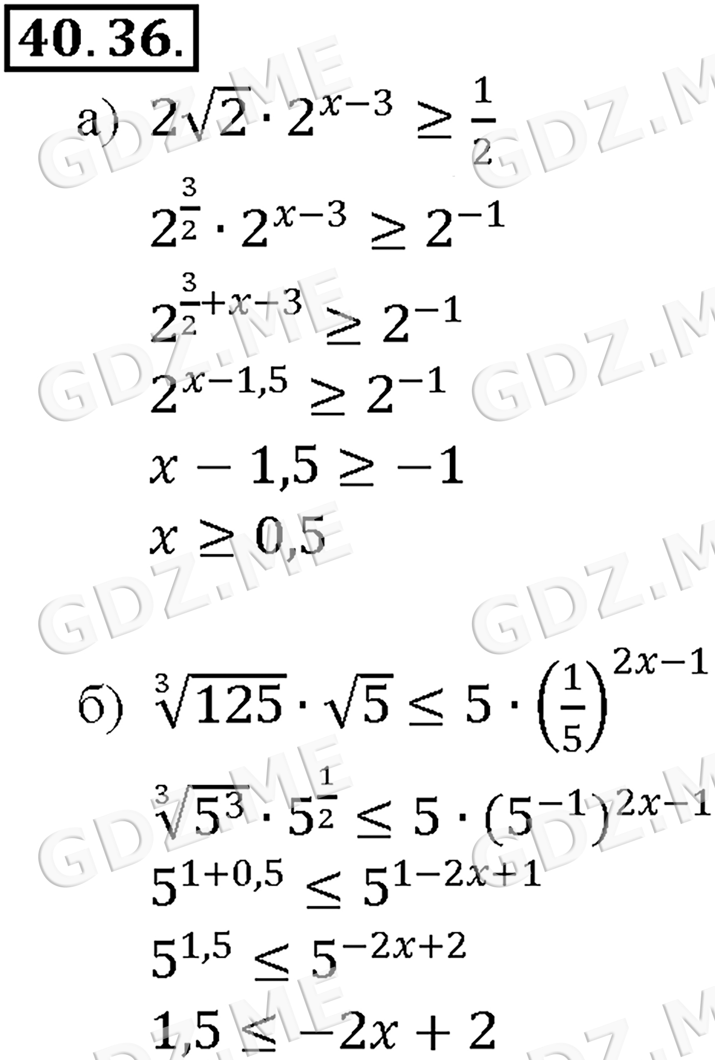 Подробный вариант решения из решебника (ГДЗ): Задание номер 40-36_1 (Глава 6 Степени и корни. Степенные функции. Глава 7 Показательная и логарифмическая функции. §40. Показательные уравнения и неравенства) по предмету Алгебра, за 10 класс, авторы учебника Мордкович, Александрова.
