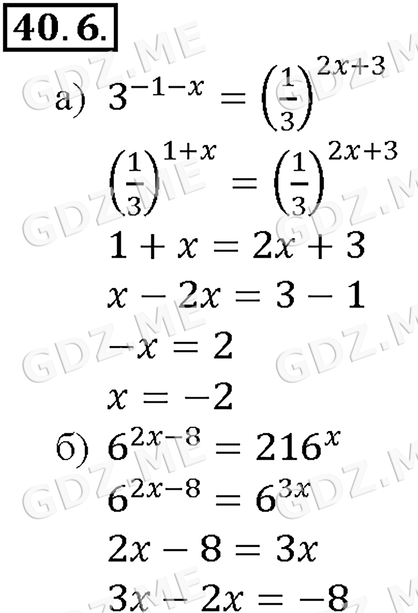 Подробный вариант решения из решебника (ГДЗ): Задание номер 40-6_1 (Глава 6 Степени и корни. Степенные функции. Глава 7 Показательная и логарифмическая функции. §40. Показательные уравнения и неравенства) по предмету Алгебра, за 10 класс, авторы учебника Мордкович, Александрова.