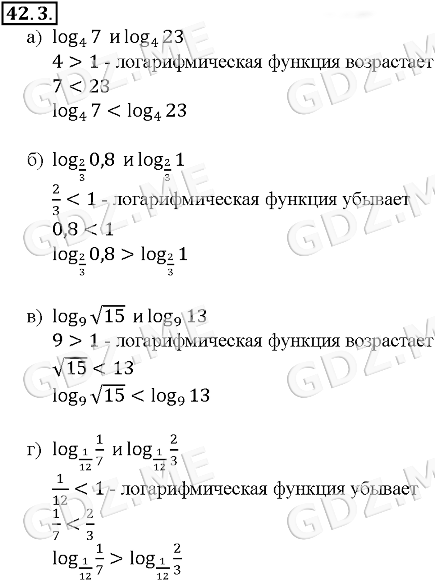 Подробный вариант решения из решебника (ГДЗ): Задание номер 42-3 (Глава 6 Степени и корни. Степенные функции. Глава 7 Показательная и логарифмическая функции. §42. Функция у = log a x, ее свойства и график) по предмету Алгебра, за 10 класс, авторы учебника Мордкович, Александрова.