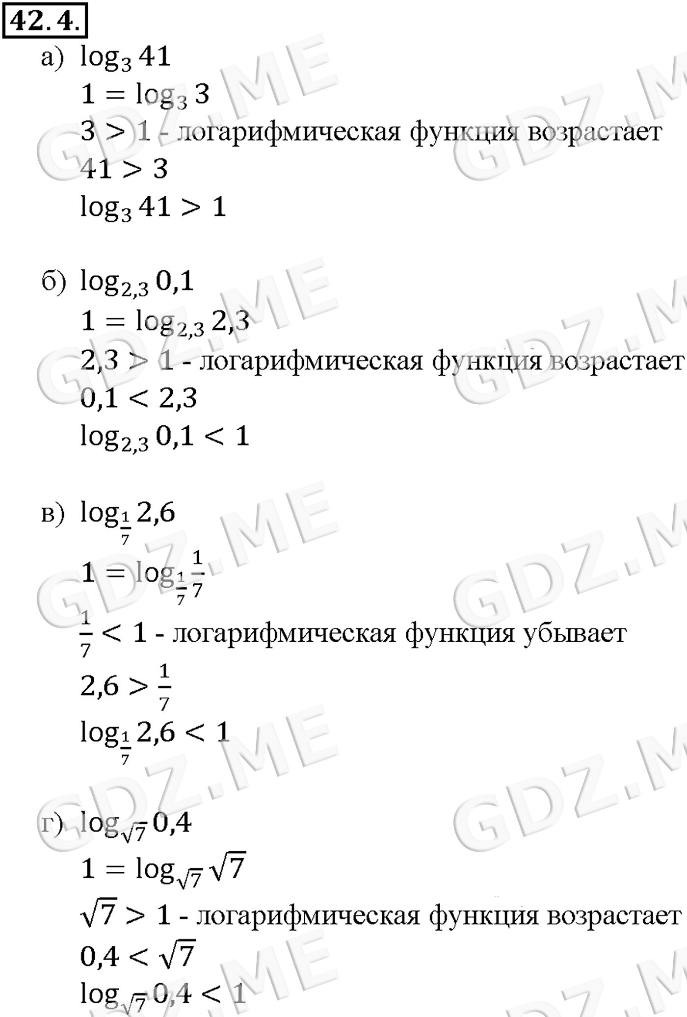 Подробный вариант решения из решебника (ГДЗ): Задание номер 42-4 (Глава 6 Степени и корни. Степенные функции. Глава 7 Показательная и логарифмическая функции. §42. Функция у = log a x, ее свойства и график) по предмету Алгебра, за 10 класс, авторы учебника Мордкович, Александрова.