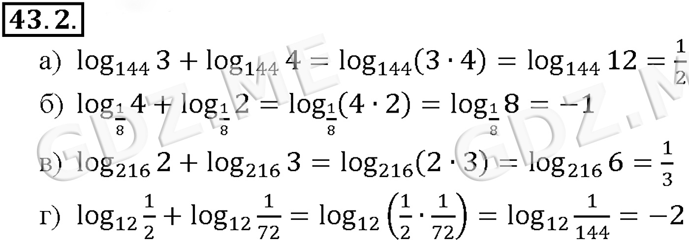 Подробный вариант решения из решебника (ГДЗ): Задание номер 43-2 (Глава 6 Степени и корни. Степенные функции. Глава 7 Показательная и логарифмическая функции. §43. Свойства логарифмов) по предмету Алгебра, за 10 класс, авторы учебника Мордкович, Александрова.