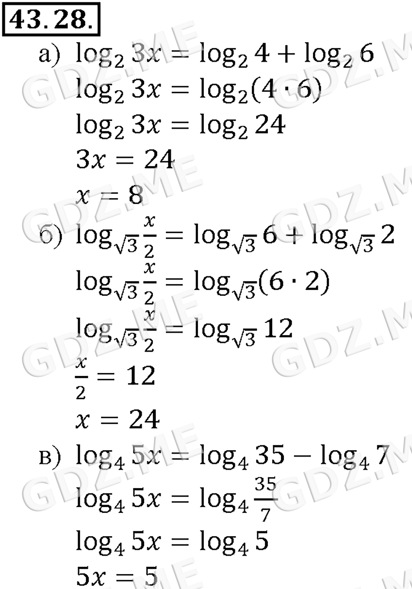 Подробный вариант решения из решебника (ГДЗ): Задание номер 43-28_1 (Глава 6 Степени и корни. Степенные функции. Глава 7 Показательная и логарифмическая функции. §43. Свойства логарифмов) по предмету Алгебра, за 10 класс, авторы учебника Мордкович, Александрова.