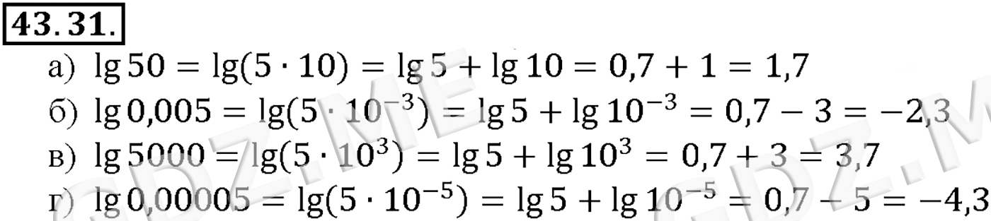 Подробный вариант решения из решебника (ГДЗ): Задание номер 43-31 (Глава 6 Степени и корни. Степенные функции. Глава 7 Показательная и логарифмическая функции. §43. Свойства логарифмов) по предмету Алгебра, за 10 класс, авторы учебника Мордкович, Александрова.