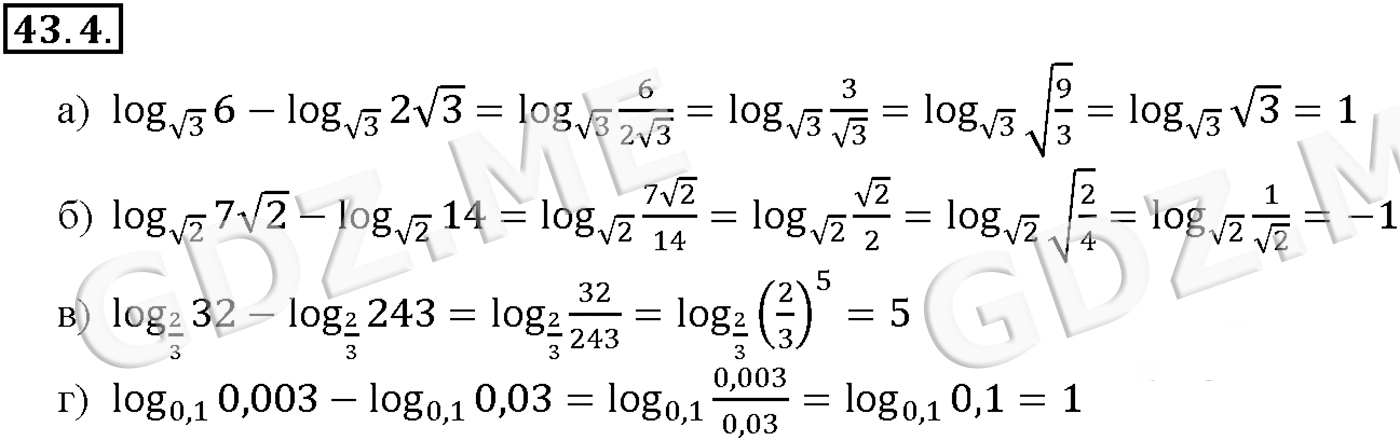 Подробный вариант решения из решебника (ГДЗ): Задание номер 43-4 (Глава 6 Степени и корни. Степенные функции. Глава 7 Показательная и логарифмическая функции. §43. Свойства логарифмов) по предмету Алгебра, за 10 класс, авторы учебника Мордкович, Александрова.