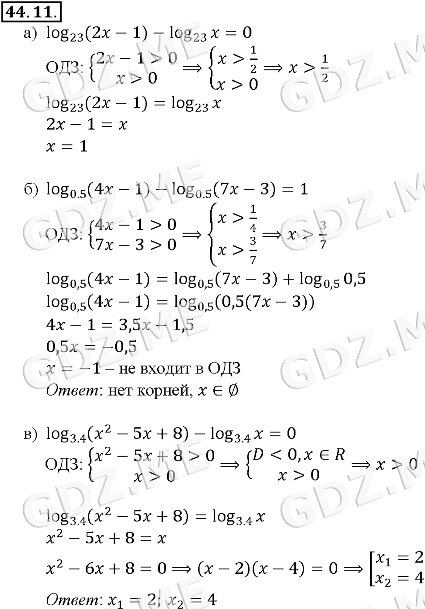 Подробный вариант решения из решебника (ГДЗ): Задание номер 44-11_1 (Глава 6 Степени и корни. Степенные функции. Глава 7 Показательная и логарифмическая функции. §44. Логарифмические уравнения) по предмету Алгебра, за 10 класс, авторы учебника Мордкович, Александрова.