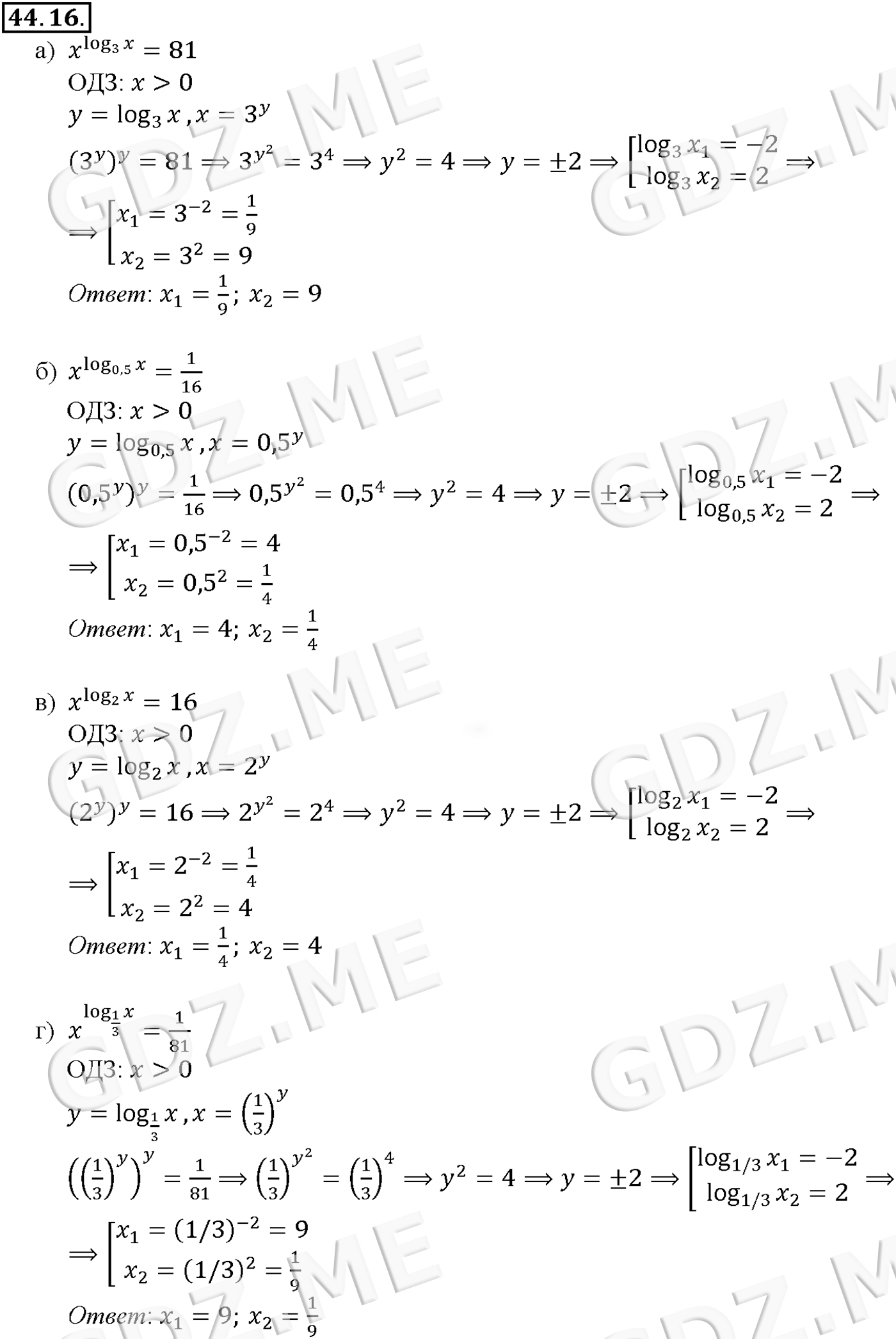Подробный вариант решения из решебника (ГДЗ): Задание номер 44-16 (Глава 6 Степени и корни. Степенные функции. Глава 7 Показательная и логарифмическая функции. §44. Логарифмические уравнения) по предмету Алгебра, за 10 класс, авторы учебника Мордкович, Александрова.
