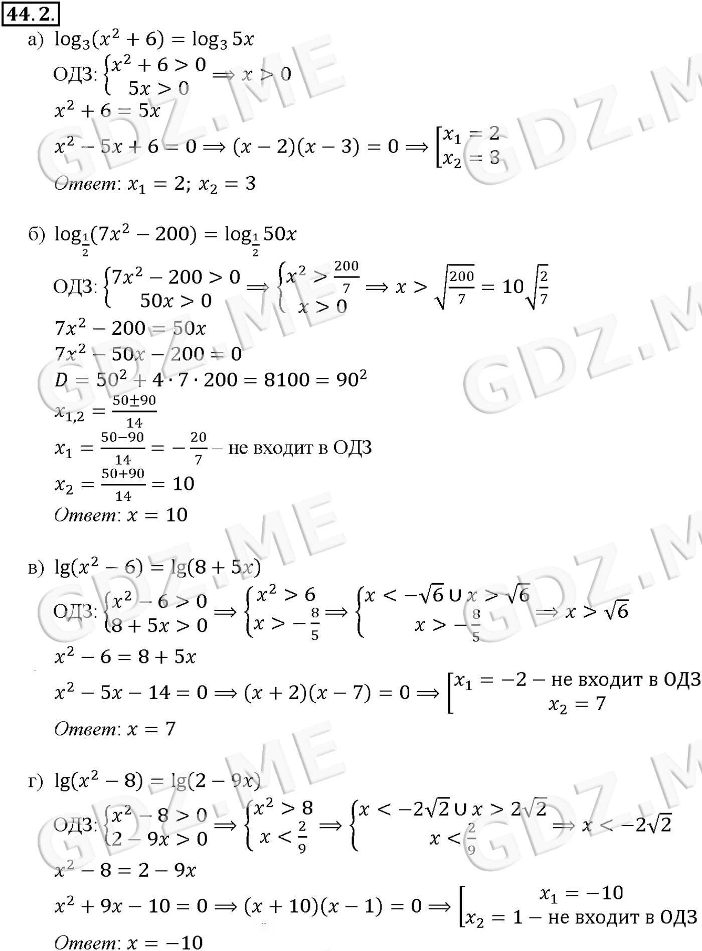 Подробный вариант решения из решебника (ГДЗ): Задание номер 44-2 (Глава 6 Степени и корни. Степенные функции. Глава 7 Показательная и логарифмическая функции. §44. Логарифмические уравнения) по предмету Алгебра, за 10 класс, авторы учебника Мордкович, Александрова.